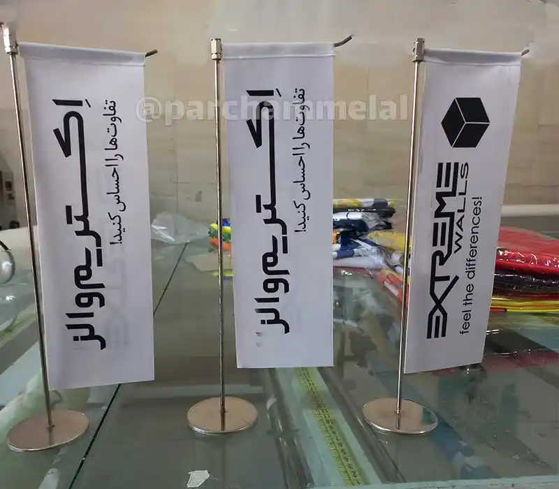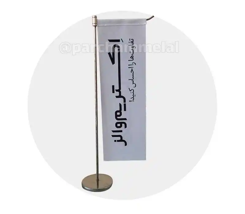 پرچم رومیزی اروپایی مدل، تولید شده با پایه ساتن آمریکایی وارداتی، و پایه استیل پولکی، یک پرچم مدرن برای نمایش لوگو برند شما و همچنین نمایش شعار تبلیغاتی شما بر روی میز کارتان میباشد، این پرچم دو رو چاپ بوده، و بخاطر روش تولید آن با برش لیزر قابل شستشو نمیباشد ولی آن را میتوان با دستمال و شوینده تمیز نمود